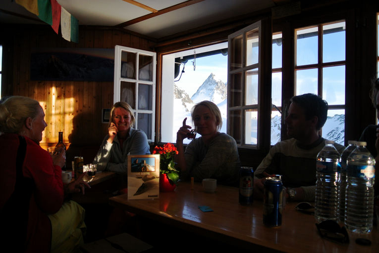 Torstai on kohtuullisen pitkä päivä, Vignettes -majalta Bertol -majalle, nousua n. 1100 metriä. Tämä vuoristomaja sijaitsee uskomattomalla paikalla kallioharjanteella n. 3300 metrin korkeudessa. Viimeiset 40 metriä majalle nousemme kallioon kiinnitettyjä tikkaita pitkin. Majalta avautuu upeat näkymät Matterhornille ja monille muille nelitonnisille.